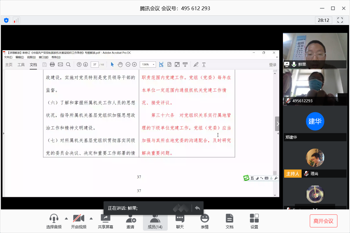 随后,鲜国建对《条例》进行了领学与解读,就《条例》修订的背景、过程和重大意义做了介绍,并对《条例》的主要修订内容进行了重点讲解。新修订的《条例》是深入贯彻习近平新时代中国特色社会主义思想、贯彻落实新时代党的建设的总要求和党的组织路线,对提高机关基层组织党的建设质量、充分发挥机关基层党组织作用、推动机关治理和各项事业发展具有十分重要的意义。